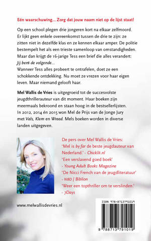 Kort na elkaar plegen enkele leerlingen zelfmoord. Er lijkt geen verband, maar dan krijgt Tess een brief die alles verandert: JIJ BENT DE VOLGENDE… Jeugdthriller van zevenvoudig Jonge Jury-winnares.