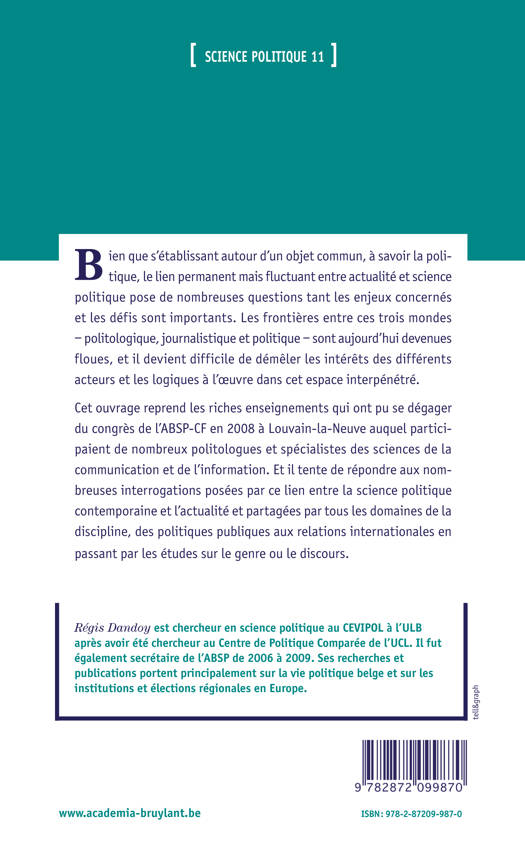 Les frontières entre les mondes de la politique, de la science politique et des médias sont aujourd'hui devenues floues, et il devient difficile de démêler les intérêts des différents acteurs et les logiques à l'oeuvre dans cet espace interpénétré. Cet ouvrage reprend les riches enseignements qui ont pu se dégager du congrès de l'ABSP-CF en 2008 à Louvain-la-Neuve et tente de répondre aux nombreuses interrogations posées par le lien entre la science politique contemporaine et l'actualité.