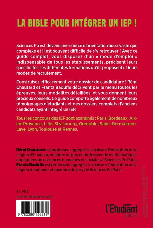 Construisez efficacement votre dossier de candidature ! Rémi Chautard et Frantz Badufle décrivent par le menu toutes les épreuves, leurs modalités détaillées, et vous donnent leurs précieux conseils. Ce guide comporte également de nombreux témoignages d’étudiants et des dossiers complets d’anciens candidats ayant intégré un IEP.