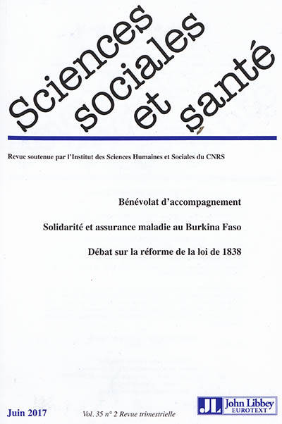 La revue de référence en sciences humaines et sociales de la santé La revue Sciences Sociales et Santé propose chaque trimestre une réflexion globale sur les enjeux majeurs de la santé : régulation des dépenses de santé, prise en charge des maladies, analyse des systèmes de santé, sida, handicap... - Volume paru en Juin 2017