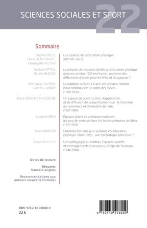 Sommaire: Les espaces de l'éducation physique. XIXe-XXe siècle. La pénurie des espaces dédiés à l'éducation physique dans les années 1920 en France: un levier des différences d'accès pour les filles et les garçons ? La natation scolaire à Caen, des espaces idoines pour ordonnancer le corps des élèves. (1880-2006) Un espace de construction, d'application et de diffusion de la psychocinétique: la Chambre de commerce et d'industrie de Paris. (1961-1984) Espaces divers et pratiques multiples: les jeux de plein air dans les écoles primaires de Metz. (1919-1931) L'introduction des jeux scolaires en éducation physique (1888-1905): une hétérotopie éducative ? Une pédagogie au château. Espaces sportifs et aménagements d'un parc au Creps de Toulouse. (1940-1986)