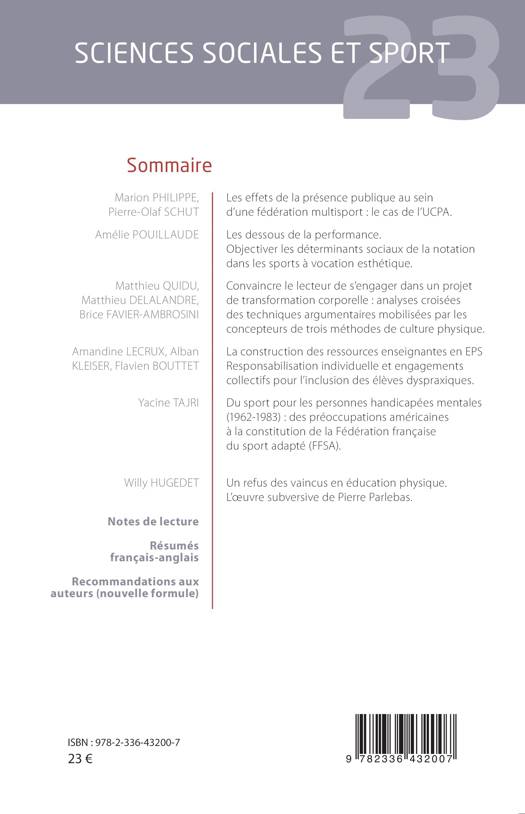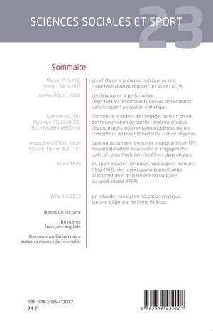 Au sommaire: Les effets de la présence publique au sein d'une fédération multisport: le cas de l'UCPA. Les dessous de la performance. Objectiver les déterminants sociaux de la notation dans les sports à vocation esthétique. Convaincre le lecteur de s'engager dans un projet de transformation corporelle: analyses croisées des techniques argumentaires mobilisées par les concepteurs de trois méthodes de culture physique. La construction des ressources enseignantes en EPS Responsabilisation individuelle et engagements collectifs pour l'inclusion des élèves dyspraxiques. Du sport pour les personnes handicapées mentales (1962-1983): des préoccupations américaines à la constitution de la Fédération française du sport adapté (FFSA). Un refus des vaincus en éducation physique. L'oeuvre subversive de Pierre Parlebas.