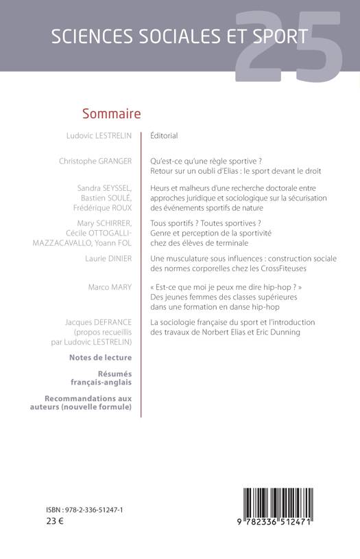 Sommaire: Qu'est-ce qu'une règle sportive ? Retour sur un oubli d'Elias: le sport devant le droit; Heurs et malheurs d'une recherche doctorale entre approches juridique et sociologique sur la sécurisation des événements sportifs de nature; Tous sportifs ? Toutes sportives ? Genre et perception de la sportivité chez des élèves de terminale; Une musculature sous influences: construction sociale des normes corporelles chez les CrossFiteuses; Est-ce que moi je peux me dire hip-hop ? Des jeunes femmes des classes supérieures dans une formation en danse hip-hop; La sociologie française du sport et l'introduction des travaux de Norbert Elias et Eric Dunning
