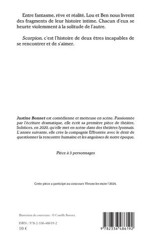 Entre fantasme, rêve et réalité, Lou et Ben nous livrent des fragments de leur histoire intime. Chacun d'eux se heurte violemment à la solitude de l'autre. Scorpion, c'est l'histoire de deux êtres incapables de se rencontrer et de s'aimer.