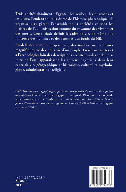 Trois entités dominent l'Égypte : les scribes, les pharaons et les dieux. Pendant toute la durée de l'histoire pharaonique, ils organisent et gèrent l'ensemble de la société ; ce sont les maîtres de l'administration comme du royaume des vivants et des morts. Cette triade définit le cadre de vie, de même que l'histoire des hommes et des femmes des bords du Nil. Au-delà des temples majestueux, des tombes aux peintures magnifiques, se devine la vie d'un peuple. Grâce aux textes et à l'archéologie, loin des descriptions architecturales et de l'histoire de l'art, apparaissent les anciens Égyptiens dans leur cadre de vie, géographique et historique, culturel et mythologique, administratif et religieux.