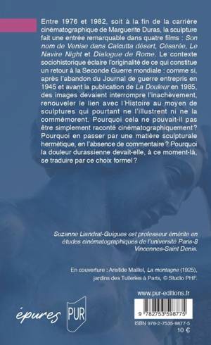 Entre 1976 et 1982, soit à la fin de la carrière cinématographique de Marguerite Duras, la sculpture fait une entrée remarquable dans quatre films : Son nom de Venise dans Calcutta désert, Césarée, Le Navire Night et Dialogue de Rome. Le contexte sociohistorique éclaire l’originalité de ce qui constitue un retour à la Seconde Guerre mondiale : comme si après l’abandon du Journal de guerre entrepris en 1945 et avant la publication de La Douleur en 1985, des images devaient interrompre l’inachèvement, renouveler le lien avec l’Histoire au moyen de sculptures qui pourtant ne l’illustrent ni ne la commémorent. Pourquoi cela ne pouvait-il pas être simplement raconté cinématographiquement ? Pourquoi en passer par une matière sculpturale hermétique, en l’absence de commentaire ? Pourquoi la douleur durassienne devait-elle, à ce moment-là, se traduire par ce choix formel ?