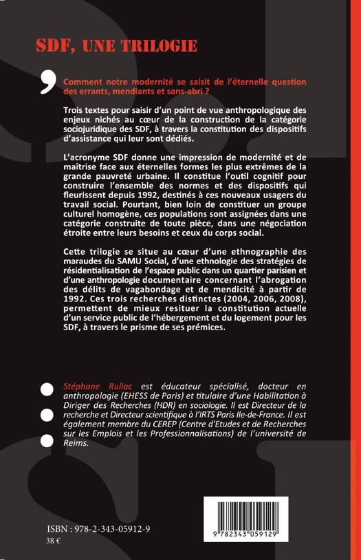 Comment notre modernité se saisit de l'éternelle question des errants, mendiants et sans-abri ? Trois textes pour saisir des enjeux nichés au coeur de la construction de la catégorie des SDF. Cette trilogie se situe au coeur d'une ethnographie des maraudes du SAMU Social, d'une ethnologie des stratégies de résidentialisation de l'espace public dans un quartier parisien et d'une anthropologie documentaire concernant l'abrogation des délits de vagabondage et de mendicité à partir de 1992.