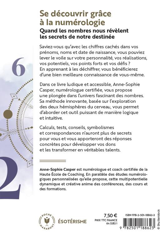 Saviez-vous qu’avec les chiffres cachés dans vos prénoms, noms et date de naissance, vous pouviez lever le voile sur votre personnalité, vos réalisations, vos potentiels, vos points forts et vos défis ? En apprenant à les déchiffrer, vous bénéficierez d’une bien meilleure connaissance de vous-même. Dans ce livre ludique et accessible, Anne-Sophie Casper, numérologue certifiée, vous propose une plongée dans l’univers fascinant des nombres. Sa méthode innovante, basée sur l’exploration des deux hémisphères du cerveau, vous permet d’aborder cet outil puissant de manière logique et intuitive. Calculs, tests, conseils, symbolismes et correspondances n’auront plus de secrets pour vous et vous apporteront des réponses concrètes pour développer vos dons et les transformer en véritables talents.