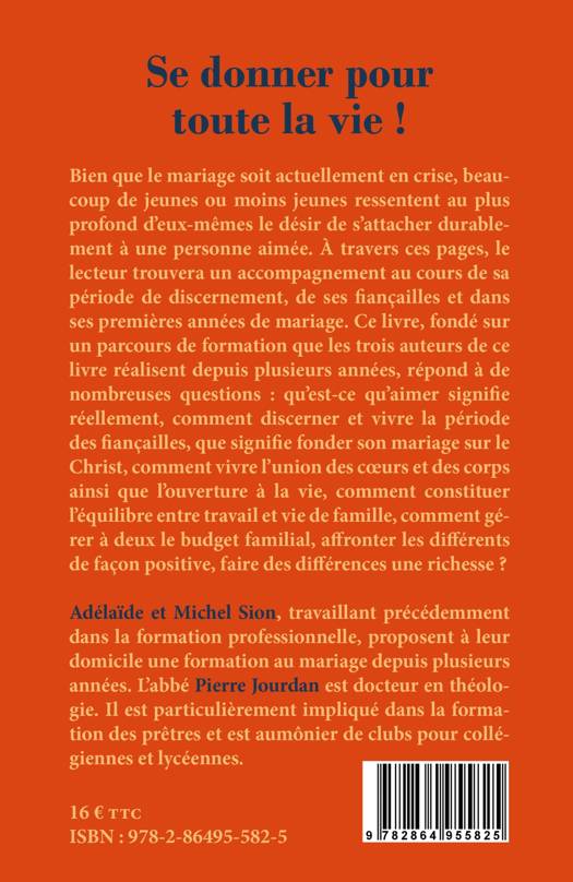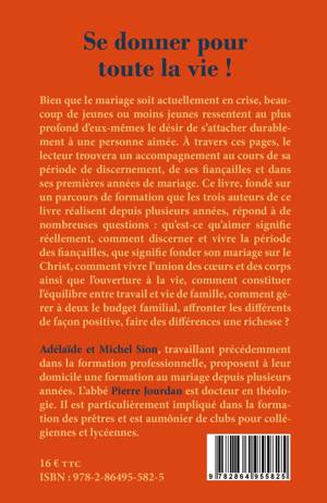 Bien que le mariage soit actuellement en crise, beaucoup de jeunes ou moins jeunes ressentent au plus profond d'eux-mêmes le désir de s'attacher durablement à une personne aimée. À travers ces pages, le lecteur trouvera un accompagnement au cours de sa période de discernement, de ses fiançailles et dans ses premières années de mariage. Ce livre, fondé sur un parcours de formation que les trois auteurs de ce livre réalisent depuis plusieurs années, répond à de nombreuses questions : qu'est-ce qu'aimer signifie réellement, comment discerner et vivre la période des fiançailles, que signifie fonder son mariage sur le Christ, comment vivre l'union des coeurs et des corps ainsi que l'ouverture à la vie, comment constituer l'équilibre entre travail et vie de famille, comment gérer à deux le budget familial, affronter les différents de façon positive, faire des différences une richesse ?