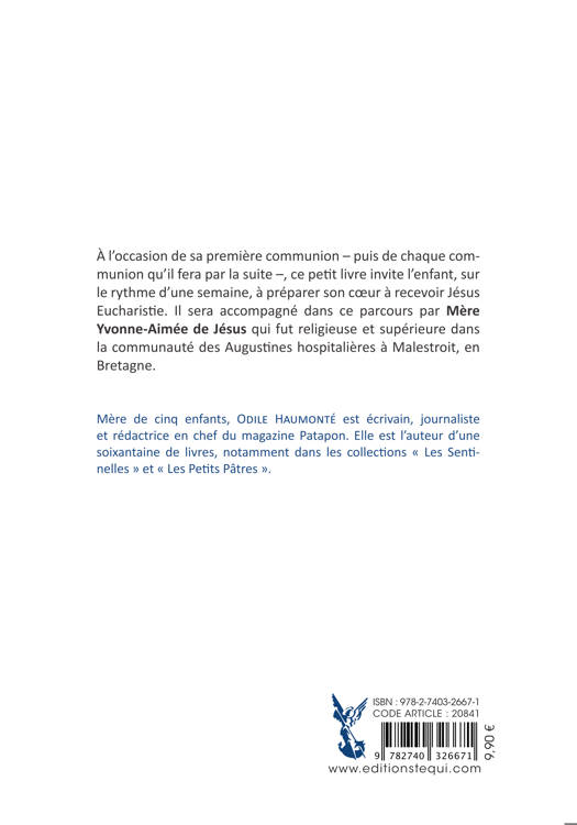 À l'occasion de sa première communion qu'elle a faite à neuf ans et demi, Yvonne-Aimée (surnommée Vonnette ou Monette) disait : « Après avoir reçu Jésus Hostie, mon bonheur fut si grand que j'ai cru mourir. Je ne pouvais plus parler, je ne savais que dire à l'Hôte de mon cœur : “Je T'aime à en mourir, je T’aime avec toutes mes forces, toute mon âme, je T'appartiens totalement”. » Qui mieux que cette sainte mystique dont la béatification approche, elle qui avait le don de reconnaître les hosties consacrées, pouvait accompagner les enfants dans cette préparation à recevoir l'Eucharistie ? Tirées de ses écrits, de nombreuses anecdotes et citations la rendent plus proche des petits lecteurs. Joliment illustrée par Clémence d'Ogny, cette préparation se déroule en huit jours sur le modèle d’une Semaine sainte, comme une montée vers la Résurrection de Jésus qui nous donne son Corps vivant.