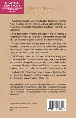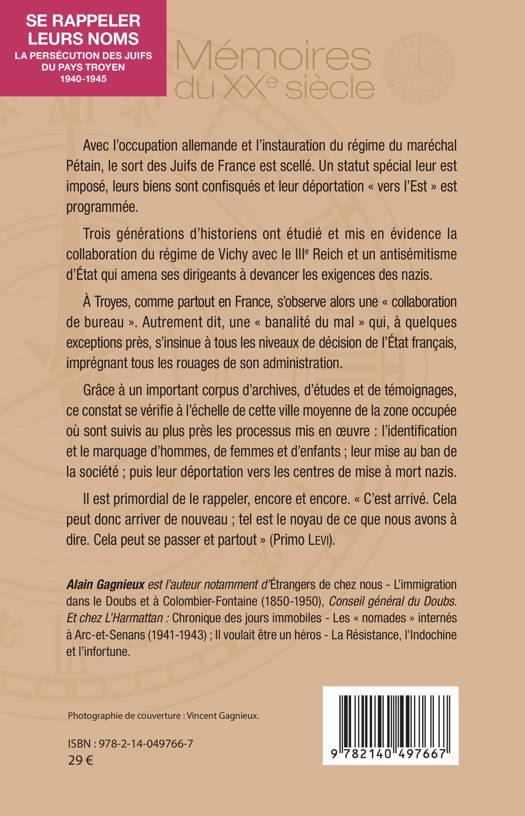 Avec l'occupation allemande et l'instauration du régime du maréchal Pétain, le sort des Juifs de France est scellé. Un statut spécial leur est imposé, leurs biens sont confisqués et leur déportation vers l'Est est programmée. Trois générations d'historiens ont étudié et mis en évidence la collaboration du régime de Vichy avec le IIIe Reich et un antisémitisme d'État qui amena ses dirigeants à devancer les exigences des nazis. À Troyes, comme partout en France, s'observe alors une collaboration de bureau . Grâce à un important corpus d'archives, d'études et de témoignages, ce constat se vérifie à l'échelle de cette ville moyenne de la zone occupée où sont suivis au plus près les processus mis en oeuvre: l'identification et le marquage d'hommes, de femmes et d'enfants; leur mise au ban de la société; puis leur déportation vers les centres de mise à mort nazis. Il est primordial de le rappeler, encore et encore. C'est arrivé. Cela peut donc arriver de nouveau; tel est le noyau de ce que nous avons à dire. Cela peut se passer et partout (Primo Levi).