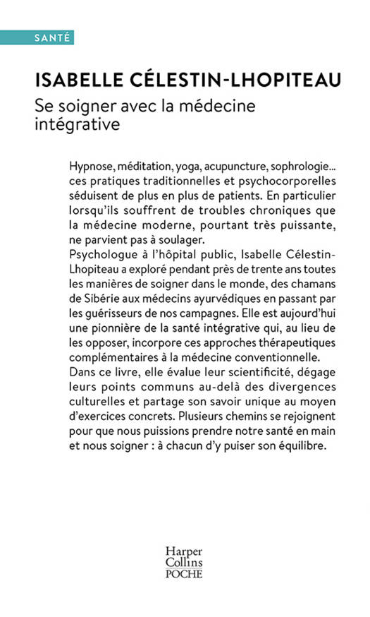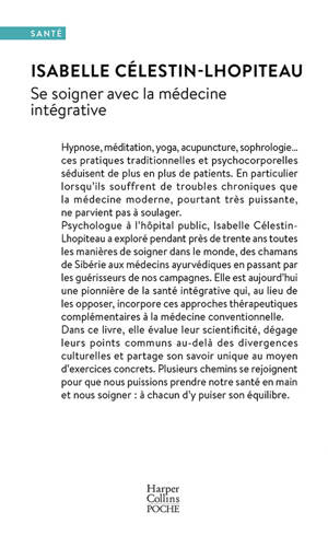 Hypnose, méditation, yoga, acupuncture, sophrologie… ces pratiques traditionnelles et psychocorporelles séduisent de plus en plus de patients. En particulier lorsqu’ils souffrent de troubles chroniques que la médecine moderne, pourtant très puissante, ne parvient pas à soulager. Psychologue à l’hôpital public, Isabelle Célestin-Lhopiteau a exploré pendant près de trente ans toutes les manières de soigner dans le monde, des chamans de Sibérie aux médecins ayurvédiques en passant par les guérisseurs de nos campagnes. Elle est aujourd’hui une pionnière de la santé intégrative qui, au lieu de les opposer, incorpore ces approches thérapeutiques complémentaires à la médecine conventionnelle. Dans ce livre, elle évalue leur scientificité, dégage leurs points communs au-delà des divergences culturelles et partage son savoir unique aux moyens d'exercices concrets. Plusieurs chemins se rejoignent pour que nous puissions prendre notre santé en main et nous soigner : à chacun d’y puiser son équilibre.