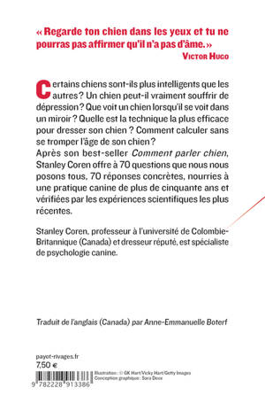 Certains chiens sont-ils plus intelligents que les autres ? Un chien peut-il vraiment souffrir de dépression ? Que voit un chien lorsqu'il se voit dans un miroir ? Quelle est la technique la plus efficace pour dresser son chien ? Comment calculer sans se tromper l'âge de son chien ? Après son best-seller «Comment parler chien», Stanley Coren offre à 70 questions que nous nous posons tous, 70 réponses concrètes, nourries à une pratique canine de plus de cinquante ans et vérifiées par les expériences scientifiques les plus récentes.