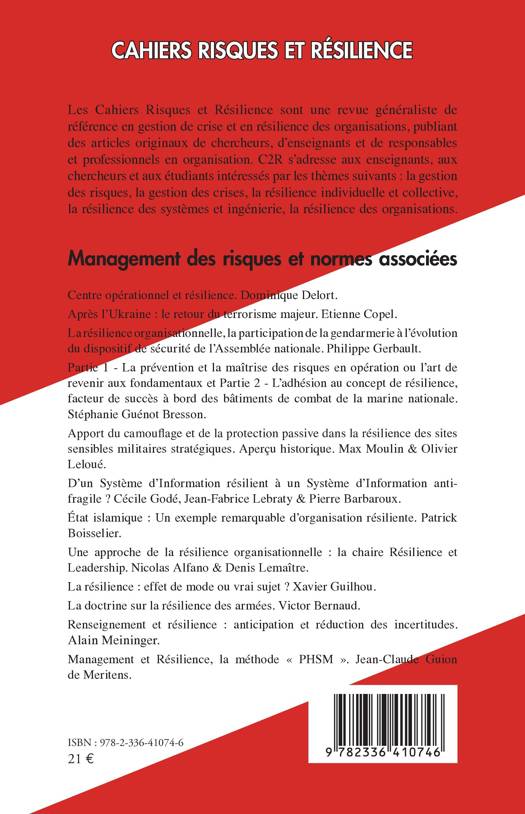 Ce numéro contient : Centre opérationnel et résilience. Dominique Delort / Après l’Ukraine : le retour du terrorisme majeur. Etienne Copel / La résilience organisationnelle, la participation de la gendarmerie à l’évolution du dispositif de sécurité de l’Assemblée nationale. Philippe Gerbault / Partie 1 - La prévention et la maîtrise des risques en opération ou l’art de revenir aux fondamentaux et Partie 2 - L’adhésion au concept de résilience, facteur de succès à bord des bâtiments de combat de la marine nationale. Stéphanie Guénot Bresson / Apport du camouflage et de la protection passive dans la résilience des sites sensibles militaires stratégiques. Aperçu historique. Max Moulin & Olivier Leloué / D’un Système d’Information résilient à un Système d’Information anti-fragile ? Cécile Godé, Jean-Fabrice Lebraty & Pierre Barbaroux / État islamique : Un exemple remarquable d’organisation résiliente. Patrick Boisselier / Une approche de la résilience organisationnelle : la chaire Résilience et Leadership. Nicolas Alfano & Denis Lemaître / La résilience : effet de mode ou vrai sujet ? Xavier Guilhou / La doctrine sur la résilience des armées. Victor Bernaud / Renseignement et résilience : anticipation et réduction des incertitudes. Alain Meininger / Management et Résilience, la méthode « PHSM ». Jean-Claude Guion de Meritens