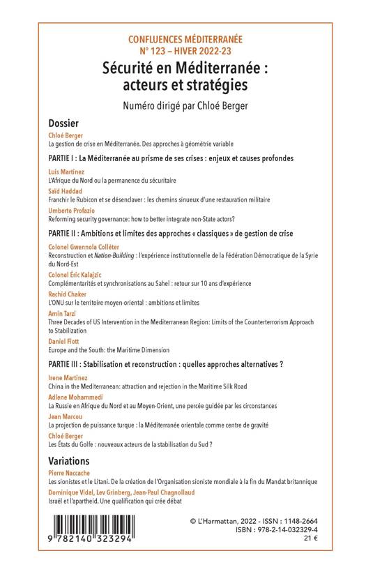 En moins d'une décennie, la Méditerranée est redevenue un espace de confrontation géostratégique, entre grandes puissances et promoteurs d'un ordre multipolaire, dont les pôles restent à définir. Affecté par des crises multiformes, cet espace, stratégique à de nombreux égards, n'a cessé de se transformer depuis la fin de la guerre froide. Des transformations que la revue Confluences Méditerranée n'a cessé d'interroger depuis sa création. Au sommaire, entre autres: La gestion de crise en Méditerranée. Des approches à géométrie variable; L'Afrique du Nord ou la permanence du sécuritaire; Franchir le Rubicon et se désenclaver: les chemins sinueux d'une restauration militaire...