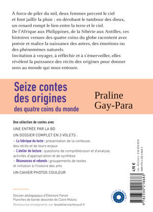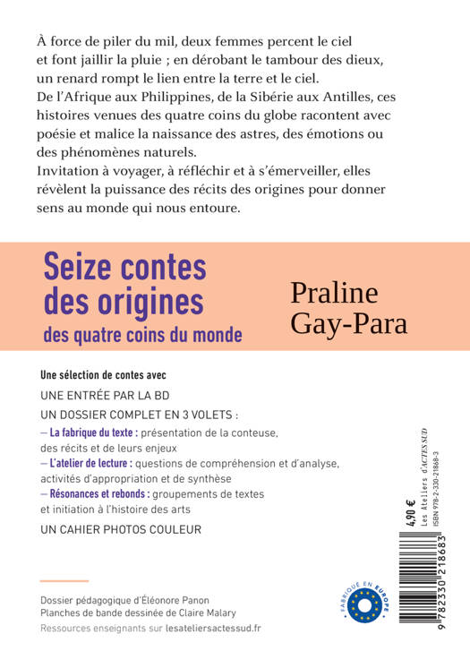 À force de piler du mil, deux femmes percent le ciel et font jaillir la pluie ; en dérobant le tambour des dieux, un renard rompt le lien entre la terre et le ciel. De l'Afrique aux Philippines, de la Sibérie aux Antilles, ces histoires venues des quatre coins du globe racontent avec poésie et malice la naissance des astres, des émotions ou des phénomènes naturels. Invitation à voyager, à réfléchir et à s'émerveiller, elles révèlent la puissance des récits des origines pour donner sens au monde qui nous entoure. Une sélection de contes avec UNE ENTRÉE PAR LA BD UN DOSSIER COMPLET EN 3 VOLETS : - La fabrique du texte : présentation de la conteuse, des récits et de leurs enjeux - L'atelier de lecture : questions de compréhension et d'analyse, activités d'appropriation et de synthèse - Résonances et rebonds : groupements de textes et initiation à l'histoire des arts UN CAHIER PHOTOS COULEUR
