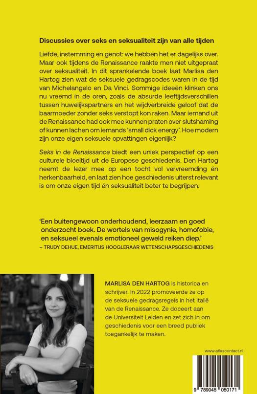 Liefde, instemming en genot: we hebben het er dagelijks over. Ook tijdens de Renaissance raakte men niet uitgepraat over seksualiteit. Sommige ideeën klinken ons nu vreemd in de oren, zoals de absurde leeftijdsverschillen tussen huwelijkspartners en het wijdverbreide geloof dat de baarmoeder zonder seks verstopt kon raken. Maar iemand uit de Renaissance had ook mee kunnen praten over slutshaming, of kunnen lachen om iemands ‘small dick energy’. In dit sprankelende boek laat Marlisa den Hartog zien wat de seksuele gedragscodes waren in de tijd van Michelangelo en Da Vinci. En hoe modern zijn onze eigen seksuele opvattingen eigenlijk?
