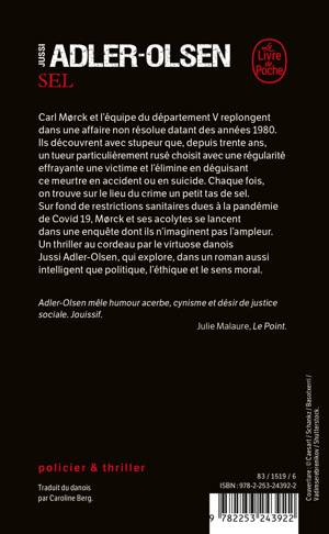 Carl Mørck et l’équipe du département V replongent dans une affaire non résolue datant des années 1980. Ils découvrent avec stupeur que, depuis trente ans, un tueur particulièrement rusé choisit avec une régularité effrayante une victime et l’élimine en déguisant ce meurtre en accident ou en suicide. Chaque fois, sur le lieu du crime, se trouve un petit tas de sel. Sur fond de restrictions sanitaires dues à la pandémie de Covid 19, Mørk et ses acolytes se lancent dans une enquête dont ils n’imaginent pas l’ampleur.