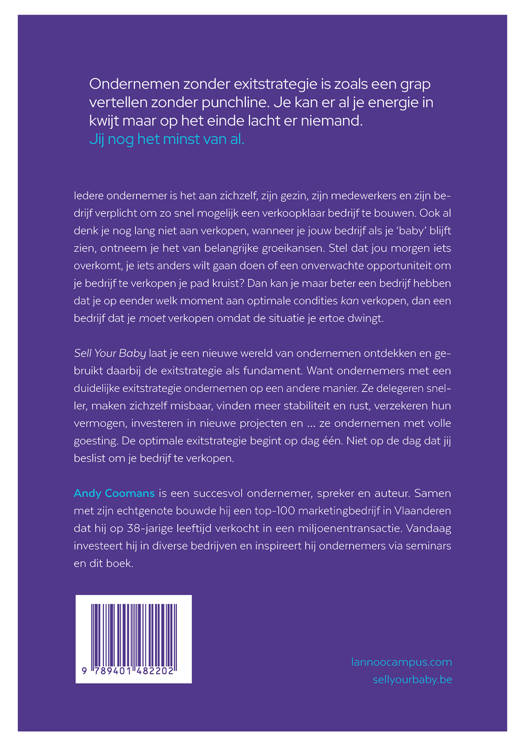 Iedere ondernemer is het aan zichzelf, zijn gezin, zijn medewerkers en zijn bedrijf verplicht om zo snel mogelijk een verkoopklaar bedrijf te bouwen. Ook al denk je nog lang niet aan verkopen, wanneer je jouw bedrijf als je 'baby' blijft zien, ontneem je het van belangrijke groeikansen. Stel dat jou morgen iets overkomt, je iets anders wilt gaan doen of een onverwachte opportuniteit om je bedrijf te verkopen je pad kruist? Dan kan je maar beter een bedrijf hebben dat je op eender welk moment aan optimale condities kan verkopen, dan een bedrijf dat je moet verkopen omdat de situatie je ertoe dwingt. Sell Your Baby laat je een nieuwe wereld van ondernemen ontdekken en gebruikt daarbij de exitstrategie als fundament. Want ondernemers met een duidelijke exitstrategie ondernemen op een andere manier. Ze delegeren sneller, maken zichzelf misbaar, vinden meer stabiliteit en rust, verzekeren hun vermogen, investeren in nieuwe projecten en ... ze ondernemen met volle goesting. De optimale exitstrategie begint op dag één. Niet op de dag dat jij beslist om je bedrijf te verkopen.
