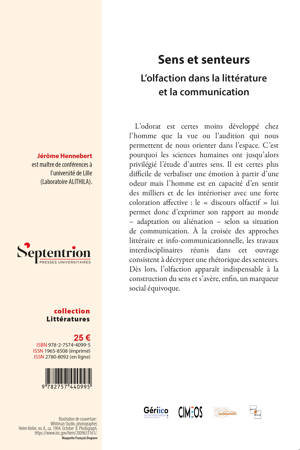 L’odorat est certes moins développé chez l’homme que la vue ou l’audition qui nous permettent de nous orienter dans l’espace. C’est pourquoi les sciences humaines ont jusqu’alors privilégié l’étude d’autres sens. Il est certes plus difficile de verbaliser une émotion à partir d’une odeur mais l’homme est en capacité d’en sentir des milliers et de les intérioriser avec une forte coloration affective : le « discours olfactif » lui permet donc d’exprimer son rapport au monde – adaptation ou aliénation – selon sa situation de communication. À la croisée des approches littéraire et info-communicationnelle, les travaux interdisciplinaires réunis dans cet ouvrage consistent à décrypter une rhétorique des senteurs. Dès lors, l’olfaction apparaît indispensable à la construction du sens et s’avère, enfin, un marqueur social équivoque.