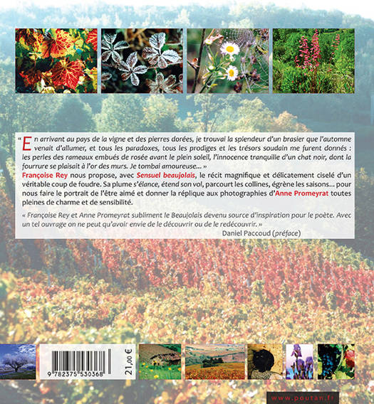 « En arrivant au pays de la vigne et des pierres dorées, je trouvai la splendeur d’un brasier que l’automne venait d’allumer, et tous les paradoxes, tous les prodiges et les trésors soudains me furent donnés : les perles des rameaux embués de rosée avant le plein soleil, l’innocence tranquille d’un chat noir dont la fourrure se plaisait à l’or des murs. Je tombai amoureuse... » Françoise Rey nous propose, avec Sensuel beaujolais, le récit magnifique et délicatement ciselé d’un véritable coup de foudre. Sa plume s’élance, étend son vol, parcourt les collines, égrène les saisons... pour nous faire le portrait de l’être aimé et donner la réplique aux photographies d’Anne Promeyrat toutes pleines de charme et de sensibilité. « Françoise Rey et Anne Promeyrat subliment le Beaujolais devenu source d’inspiration pour le poète. Avec un tel ouvrage on ne peut qu’avoir envie de le découvrir ou de le redécouvrir. » Daniel Paccoud (préface)