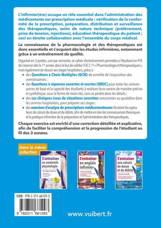 Les exercices de la première partie tournent autour des principes de chimie, de la pharmacocinétique, des formes pharmaceutiques, des dosages et préparations. Pour réviser le semestre 2, les auteurs proposent des exercices plus complexes autour des familles thérapeutiques, de la pharmacodépendance et de la toxicologie, de la dispensation de médicaments en pédiatrie et en gériatrie. Enfin, pour valider le semestre 5 et être à l'aise en stages, on retrouve dans une 3e partie des études de situations autour des prescriptions médicales et infirmières, du circuit du médicament, de la collaboration entre soignants, et des autres moyens thérapeutiques qui doivent être connus de l'étudiant infirmier.