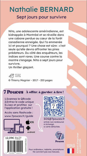 Un livre numérique matérialisé par une jolie carte, à lire sur une application stimulante ! Nita, une adolescente amérindienne, est kidnappée à Montréal et se réveille dans une cabane perdue au cœur de la forêt canadienne enneigée. Qui l'a emmenée ici et pourquoi ? Une chose est sûre : c'est seule qu'elle devra affronter les pires prédateurs. Du côté des enquêteurs, les indices sont rares. Une course contre la montre s'engage. Nita a sept jours pour survivre. Un thriller glaçant.