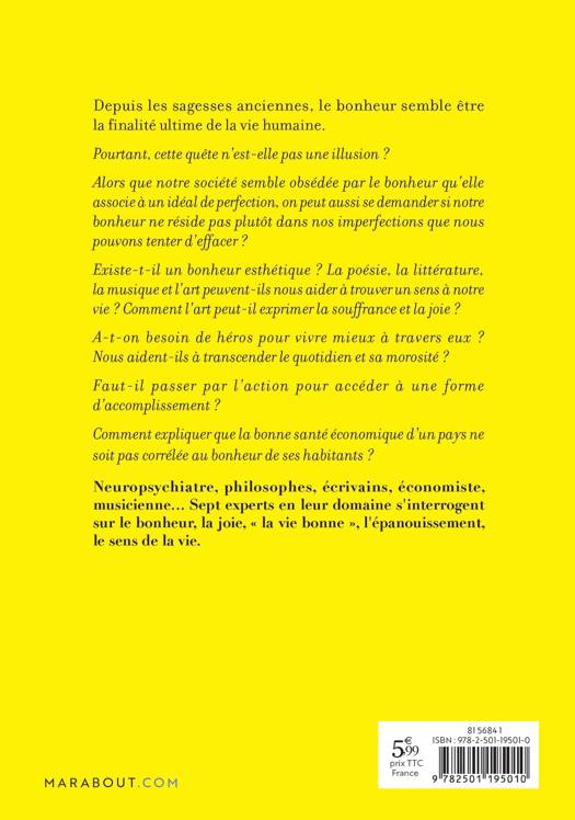 Existe-t-il un bonheur esthétique ? La poésie, la littérature, la musique et l'art peuvent-ils nous aider à trouver un sens à notre vie ? Comment l'art peut-il exprimer la souffrance et la joie ? A-t-on besoin de héros pour vivre mieux à travers eux ? Nous aident-ils à transcender le quotidien et sa morosité ? Faut-il passer par l'action pour accéder à une forme d'accomplissement ? Comment expliquer que la bonne santé économique d'un pays ne soit pas corrélée au bonheur de ses habitants ? Neuropsychiatre, philosophes, écrivains, économiste, musicienne… Sept experts en leur domaine s'interrogent sur le bonheur, la joie, « la vie bonne », l'épanouissement, le sens de la vie.