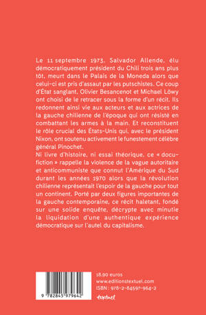 Un hommage aux militants qui ont dû affronter, le 11 septembre 1973, le coup militaire sanglant du Général Pinochet et de ses troupes. Ni livre d'histoire, ni essai théorique, ce récit politique romancé relate cette séquence historique en épousant le point de vue d'acteurs et actrices de la gauche chilienne de l'époque. Parmi eux, celui qui a refusé de capituler jusqu'à son dernier souffle : Salvador Allende. Ce docu-fiction signé par deux figures importantes de la gauche contemporaine est basé sur une solide enquête. 50 ans du coup d'État de Pinochet au Chili le 11 septembre 2023.