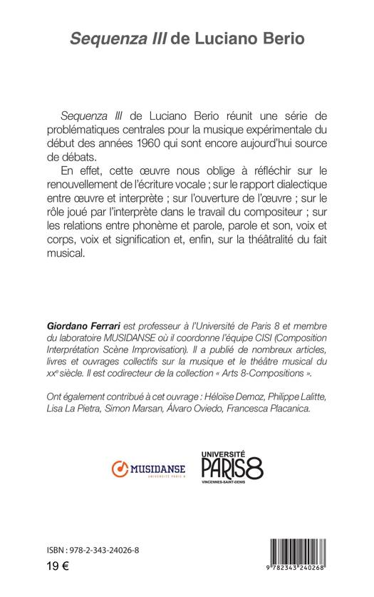 Sequenza III de Luciano Berio réunit une série de problématiques centrales pour la musique expérimentale du début des années 1960 qui sont encore aujourd'hui source de débats. En effet, cette oeuvre nous oblige à réfléchir sur le renouvellement de l'écriture vocale ; sur le rapport dialectique entre oeuvre en interprète ; sur l'ouverture de l'oeuvre ; sur le rôle joué par l'interprète dans le travail du compositeur ; sur les relations entre phonème et parole, parole et son, voix et corps, voix et signification et, enfin, sur la théâtralité du fait musical.
