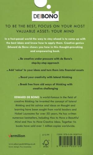 If you want to be the best, focus on your most valuable asset: the power of your creative mind. As competition and the pace of change intensify, companies and individuals need to harness their creativity to stay ahead of the field. Under pressure, people often think they can't be creative; many more are convinced they are not creative at all because they have never been "arty." Creative genius Edward de Bono debunks these common notions in this remarkable book. He shows how creativity is a learnable skill--one that everyone can use to improve their performance. He then explains how you can unlock your own creativity to reap the personal and professional rewards it will bring. Learn how to be creative on demand with de Bono's step-by-step approach; add value to ideas and turn them into financial assets; boost creativity with the power of lateral thinking; and break free from old ways of thinking with creative challenging.