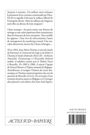 «Serpents à sornettes» : Un tailleurs vient réclamer le paiement d'un costume commandé par Dieu. De fil en aiguille il devient le tailleur officiel de l'entreprise divine. Mais les affaires du Seigneur sont-elles au-dessus de tout soupçon ?
