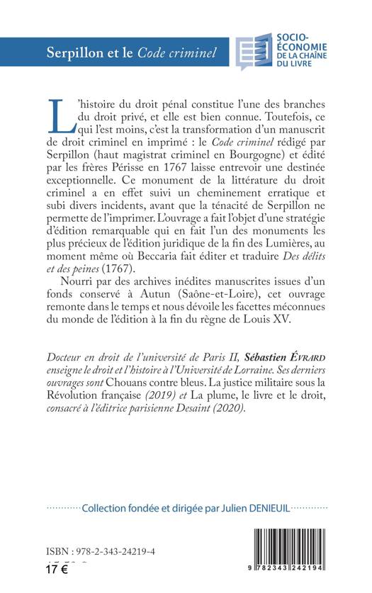 L’histoire du droit pénal constitue l’une des branches du droit privé, et elle est bien connue. Toutefois, ce qui l’est moins, c’est la transformation d’un manuscrit de droit criminel en imprimé : le Code criminel rédigé par Serpillon (haut magistrat criminel en Bourgogne) et édité par les frères Périsse en 1767 laisse entrevoir une destinée exceptionnelle. Ce monument de la littérature du droit criminel a en effet suivi un cheminement erratique et subi divers incidents, avant que la ténacité de Serpillon ne permette de l’imprimer. L’ouvrage a fait l’objet d’une stratégie d’édition remarquable qui en fait l’un des monuments les plus précieux de l’édition juridique de la fin des Lumières, au moment même où Beccaria fait éditer et traduire Des délits et des peines (1767). Nourri par des archives inédites manuscrites issues d’un fonds conservé à Autun (Saône-et-Loire), cet ouvrage remonte dans le temps et nous dévoile les facettes méconnues du monde de l’édition à la fin du règne de Louis XV.