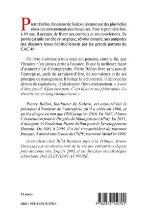 Ce livre s’adresse à tous ceux qui pensent, comme lui, que l’histoire n’est jamais écrite à l’avance. Et que la meilleure façon d’avancer c’est d’entreprendre. Pierre Bellon livre sa vision de l’entreprise, parle de sa raison d’être, de ses valeurs et de ses principes de management. Il fustige la technocratie. Il dénonce les dérives du capitalisme. Il plaide pour l’intra-entrepreneur. « Avant d’être grand, il faut être petit. C’est là toute ma philosophie. La réussite est un long cheminement ».