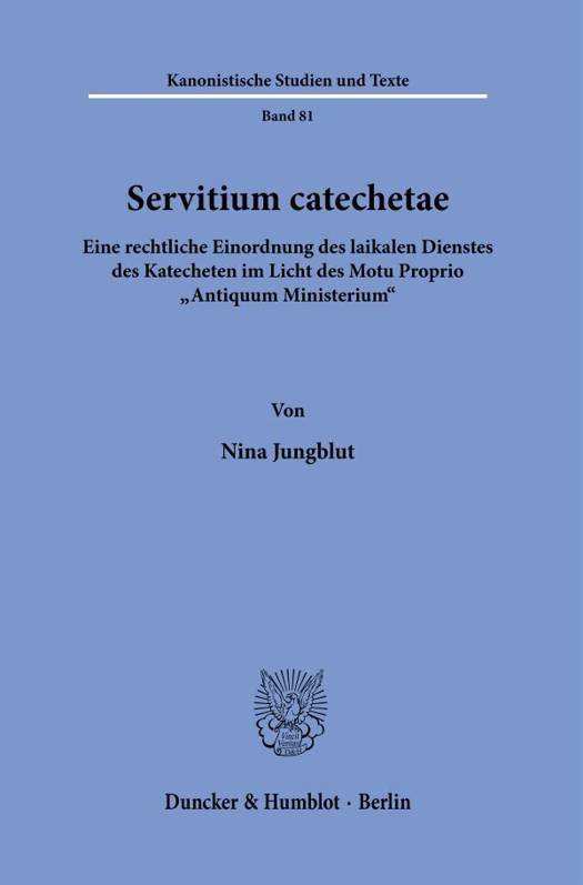 English summary: Servitium Catechetae. A legal Classification of the Lay Service of Catechist in the Light of the Motu Proprio Antiquum Ministerium The lay service of catechist, as introduced by the Motu Proprio Antiquum Ministerium, attributes great importance to the laity in fulfilling the mission of evangelization. In order to define clearly the canonical status of this service, and so enable it to develop its potential, the concepts of office and service need to be defined in canonical terms as does the understanding of the nature of the ecclesiastical office within the context of its historical development and within the framework of the current Canon law, including an analysis of the so-called catechistae in cc. 776, 780 and 785 CIC/1983. German description: Im Mai 2021 promulgierte Papst Franziskus das Motu Proprio Antiquum Ministerium und fuhrte darin den laikalen Dienst des Katecheten ein. Mit diesem rechtsverbindlichen Schreiben starkte er nicht nur die Stellung der Laien, sondern legte zugleich die bedeutsame und wesenhaft kirchliche Aufgabe der Evangelisierung gezielt in deren Hande. Grundlegend fur die vordergrundig kanonistische Analyse dieses neuen laikalen Dienstes ist die rechtssprachliche Einordnung der Begriffe Amt und Dienst sowie die kirchenrechtliche Bestimmung des Kirchenamtes in seiner Entwicklung und im geltenden Recht. Da bereits kodikarisch normierte Dienste und Amter - die catechistae in den cc. 776, 780 und 785 CIC/1983 - bestehen, wird der neu eingefuhrte laikale Dienst des Katecheten zu diesen Diensten und Amtern abgegrenzt, um ihn eindeutig definieren sowie rechtlich einordnen und somit auch fruchtbar in der kirchlichen Sendung einsetzen zu konnen.
