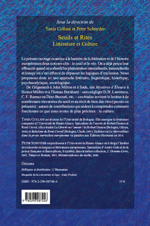 Cet ouvrage examine à la lumière de la littérature et de l'histoire européennes deux notions-clés : le seuil et le rite. De Guilgamesh à John Milton et à Sade, des Mystères d'Eleusis à Heiner Müller et à Thomas Bernhard - sans négliger D.H. Lauwrence, C.F. Ramuz ou Dino Buzzati, etc., - ces études invitent le lecteur à de nombreuses traversées du seuil et au récit de bien des rites (passés ou présents) : autant de contributions qui invitent à comprendre comment fonctionne ce que nous avons de plus précieux : la culture.