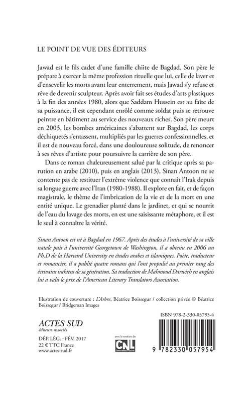 Jawad est le fils cadet d'une famille chiite de Bagdad. Son père le prépare à exercer la même profession rituelle que lui, celle de laver et d'ensevelir les morts avant leur enterrement, mais Jawad s'y refuse et rêve de devenir sculpteur. Après avoir fait ses études d'arts plastiques à la fin des années 1980, alors que Saddam Hussein est au faîte de sa puissance, il est cependant enrôlé comme soldat puis se retrouve peintre en bâtiment au service des nouveaux riches. Son père meurt en 2003, les bombes américaines s'abattent sur Bagdad, les corps déchiquetés s'entassent, multipliés par les guerres confessionnelles, et il est de nouveau forcé, dans une douloureuse solitude, de renoncer à ses rêves d'artiste pour poursuivre la carrière de son père. Dans ce roman chaleureusement salué par la critique après sa parution en arabe (2010), puis en anglais (2013), Sinan Antoon ne se contente pas de restituer l'extrême violence que connaît l'Irak depuis sa longue guerre avec l'Iran (1980-1988). Il explore en fait, et de façon magistrale, le thème de l'imbrication de la vie et de la mort en une entité unique. Le grenadier planté dans le jardinet, et qui se nourrit de l'eau du lavage des morts, en est une saisissante métaphore, et il est le seul à connaître la vérité.