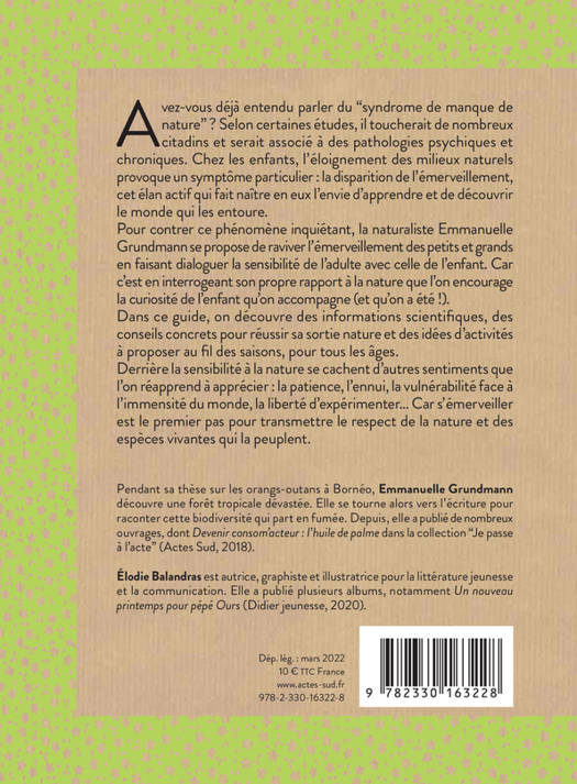 Chez les enfants, l'éloignement des milieux naturels provoque la disparition progressive de l'émerveillement, cet élan actif qui fait naître en eux l'envie d'apprendre et de découvrir le monde qui les entoure. Pour apaiser ce symptôme du "manque de nature", ce guide nous invite à renouer avec les émotions qui naissent chez les petits comme les grands au contact de la nature, pour transmettre l'amour du vivant d'une génération à l'autre.