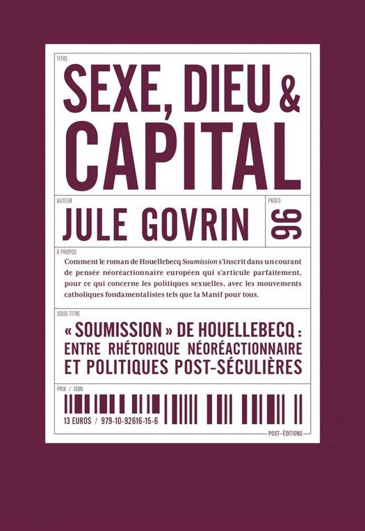 Le 7 janvier 2015, jour de l'attentat contre Charlie Hebdo, paraissait le livre de Michel Houellebecq, Soumission, dystopie inspirée par la thèse du « grand remplacement ». En couverture du numéro de Charlie Hebdo paru le même jour, la caricature d'un Houellebecq décati, proférant : « En 2015 je perds mes dents... en 2022 je fais ramadan ». C'est cette cruelle séquence historique, stupéfiante de compacité symbolique, que la jeune philosophe allemande Jule Govrin se propose ici d'analyser. Elle montre comment Soumission s'inscrit dans un agencement néoréactionnaire européen, homophobe et islamophobe, fondé sur la haine de 68 et sur l'idée d'un retour aux « valeurs » patriarcales traditionnelles présentées comme ultime refuge face aux injustices du néolibéralisme économique.