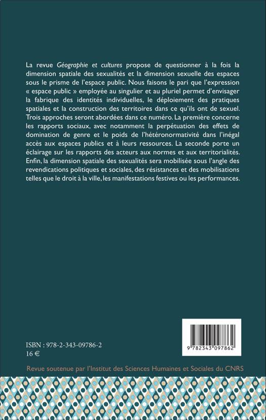 Ce numéro questionne à la fois la dimension spatiale des sexualités et la dimension sexuelle des espaces sous le prisme de l'espace public. L'expression « espace public » employée au singulier et au pluriel permet d'envisager la fabrique des identités individuelles, le déploiement des pratiques spatiales et la construction des territoires dans ce qu'ils ont de sexuel. Trois approches sont ici abordées, la première concerne les rapports sociaux, la deuxième porte un éclairage sur les rapports des acteurs aux normes, aux territorialités et enfin, la dernière mobilise la dimension spatiale des sexualités sous l'angle des revendications politiques et sociales.