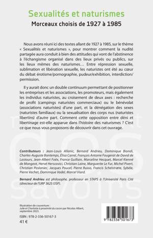 Nous avons réuni ici des textes allant de 1927 à 1985, sur le thème Sexualités et naturismes, pour montrer comment la nudité partagée aura conduit à bien des attitudes qui vont de l'abstinence à l'échangisme organisé dans des lieux privés ou publics, sur les lieux mêmes des naturismes... Entre répression sexuelle, sublimation et libération sexuelle, les naturistes ont été au coeur du débat érotisme/pornographie, pudeur/exhibition, interdiction/ permission. Il y aurait donc un double continuum permettant de positionner les entreprises et les associations, les promoteurs, mais également les individus naturistes, au croisement de deux axes: recherche de profit (campings naturistes commerciaux) ou le bénévolat (associations naturistes) d'une part, et la dénégation des sexes (naturistes familiaux) ou la sexualisation des corps nus (naturistes libertins) d'autre part. Comment cette opposition entre déni et libertinage est-elle apparue dans l'histoire des naturismes ? C'est ce que nous vous proposons de découvrir dans cet ouvrage.