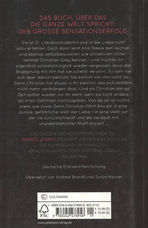 Sie ist 21, Literaturstudentin und in der Liebe nicht allzu erfahren. Doch dann lernt Ana Steele den reichen und ebenso unverschämt selbstbewussten wie attraktiven Unternehmer Christian Grey bei einem Interview für ihre Uni-Zeitung kennen. Und möchte ihn eigentlich schnellstmöglich wieder vergessen, denn die Begegnung mit ihm hat sie zutiefst verwirrt. Sosehr sie sich aber darum bemüht: Sie kommt von ihm nicht los. Christian führt Ana ein in eine dunkle, gefährliche Welt der Liebe - in eine Welt, vor der sie zurückschreckt und die sie doch mit unwiderstehlicher Kraft anzieht ...