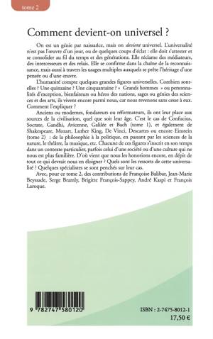 L'humanité compte quelques grandes figures universelles. Combien sont-elles ? Elles vivent encore parmi nous, car nous revenons sans cesse à elles. Comment l'expliquer ? Anciens ou modernes, fondateurs ou réformateurs, ces "grands hommes" ont leur place aux sources de la civilisation quel que soit leur âge. C'est le cas de Confucius, Socrate, Gandhi, Avicenne, Galilée et Bach (tome 1) et également de Shakespeare, Mozart, Luther King, De Vinci, Descartes et Einstein (tome 2). D'où vient que nous les honorions encore, en dépit de tout ce qui devrait nous en éloigner ? Quels sont les ressorts de cette universalité ?