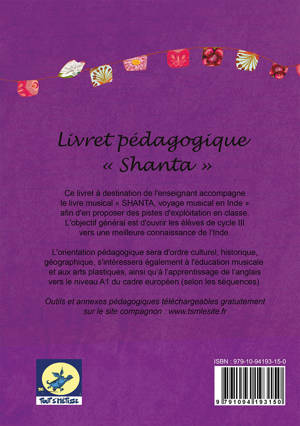 Ce livret à destination de l'enseignant accompagne le livre musical « SHANTA, voyage musical en Inde » afin d'en proposer des pistes d'exploitation en classe. L'objectif général est d'ouvrir les élèves de cycle III vers une meilleure connaissance de l'Inde. L'orientation pédagogique sera d'ordre culturel, historique, géographique, s'intéressera également à l'éducation musicale et aux arts plastiques, ainsi qu'à l'apprentissage de l'anglais vers le niveau A1 du cadre européen (selon les séquences).