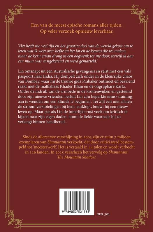 "Het heeft me veel tijd en het grootste deel van de wereld gekost om te leren wat ik weet over liefde en het lot en de keuzes die we maken, maar de kern ervan drong in een oogwenk tot me door, terwijl ik aan een muur was vastgeketend en werd gemarteld." Lin ontsnapt uit een Australische gevangenis en reist met een vals paspoort naar India. Hij dompelt zich onder in de kleurrijke chaos van Bombay, waar hij de trouwe gids Prabaker ontmoet en bevriend raakt met de maffiabaas Khader Khan en de ongrijpbare Karla. Onder de indruk van de armoede in de krottenwijken en gesteund door zijn nieuwe vrienden besluit Lin zijn beperkte EHBO-training aan te wenden om een kliniek te beginnen. Terwijl een niet aflatende stroom verstotelingen bij hem aanklopt, bouwt hij een nieuw leven op. Maar pas als Lin de innerlijke rust voelt om kritisch te kijken naar zijn eigen daden, komt de liefde waarnaar hij zo verlangt binnen handbereik. Shantaram is een onweerstaanbare epische roman met een indrukwekkende levensboodschap, voor een groot deel gebaseerd op het leven van de auteur. 'Een meeslepende en intelligente roman, vol levendige personages… Roberts' passievolle schrijfstijl is verfrissend. Hij neemt ons mee door de sloppenwijken en opiumhuizen van Bombay, langs bordelen en expatbars, en zegt: "Kom mee." En wij volgen.' – The Washington Post 'Shantaram is betoverend. Maar belangrijker nog: het leert ons een waardevolle les… De mensen die we opsluiten zijn ook gewoon mensen. Ze verdienen het om met waardigheid te worden behandeld. Sommigen van hen zijn misschien uitzonderlijk. Sommigen zijn zelfs geniaal.' – Ayelet Waldman, auteur van 'De weg door het park' 'Shantaram is volkomen uniek, ronduit gedurfd en heerlijk ongeremd. Dit boek weet zelfs de meest fantasierijke geest te verrassen.' – ELLE
