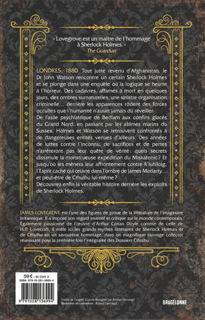 De l'asile psychiatrique de Bedlam aux confins glacés du Grand Nord, en passant par les abîmes marins du Sussex, Holmes et Watson se retrouvent confrontés à de dangereuses entités venues d'ailleurs. Des années de luttes contre l'inconnu, de sacrifices et de pertes n'arrêteront pas leur quête de vérité : quels secrets dissimule la monstrueuse expédition du Miskatonic ? Et jusqu'où les mènera leur affrontement contre R'luhlloig, l'Esprit caché qui oeuvre dans l'ombre de James Moriarty... et peut-être de Cthulhu lui-même ?