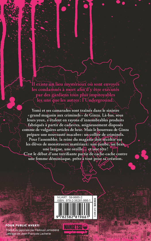 Yomi et ses camarades sont traînés dans le sinistre « grand magasin aux criminels » de Ginza. Là-bas, sous leurs yeux, s'étalent en rayons d'innombrables produits fabriqués à partir de cadavres, soigneusement disposés comme de vulgaires articles de luxe. Mais le bourreau de Ginza prépare une nouveauté macabre : un collier de criminels. Pour l'assembler, la reine du magasin doit récolter sur les élèves de monstrueux matériaux : une jambe, un bras, une langue, une oreille... et une tête ! C'est le début d'une terrifiante partie de cache-cache contre une femme démoniaque, prête à tout pour sa création.