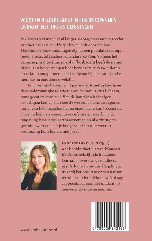 In Shinrin-yoku beschrijft journalist Annette Lavrijsen de wonderbaarlijke relatie tussen de natuur, ons lichaam, onze geest en onze ziel. Aan de hand van haar eigen ervaringen laat zij zien hoe de westerse mens de Japanse kunst van het bosbaden in zijn eigen leven kan toepassen. Door middel van eenvoudige oefeningen waarbij je de omgeving bewuster leert waarnemen en alle zintuigen getraind worden, leer je hoe je via de natuur weer in verbinding kunt komen met jezelf.We publiceren alleen reviews die voldoen aan de voorwaarden voor reviews. Bekijk onze voorwaarden voor reviews.