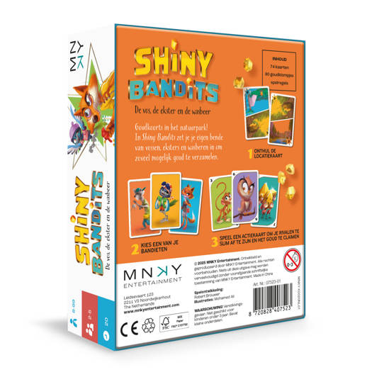 Goudkoorts in het natuurpark! In Shiny Bandits zet je je eigen bende van vossen, eksters en wasberen in om zoveel mogelijk goud te verzamelen. 1 Onthul de locatiekaart 2 Kies een van je bandieten 3 Speel een actiekaart om je rivalen te slim af te zijn en het goud te claimen