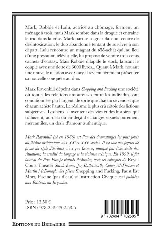 Mark Ravenhill dépeint dans Shopping and Fucking une société où toutes les relations amoureuses entre les individus sont conditionnées par l’argent, de sorte que chacun se vend et que chacun achète l’autre. Le réalisme le plus crû côtoie des fictions subjectives. Les héros s’inventent des vies et des histoires qui trahissent, au-delà ou en-deçà d’échanges sexuels purement mercantiles, un désir d’amour authentique.